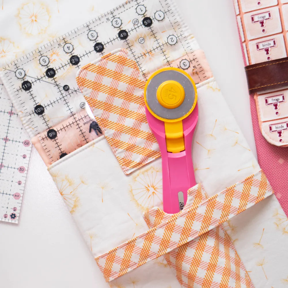 The Cutting Kit is a padded, portable folder that keeps mid-size quilting rulers snug and scratch-free, with a secure pocket for a straight handled rotary cutter. No more chipped rulers or bottom-of-the-bag scavenger hunts—just everything together in one tidy, handmade case.